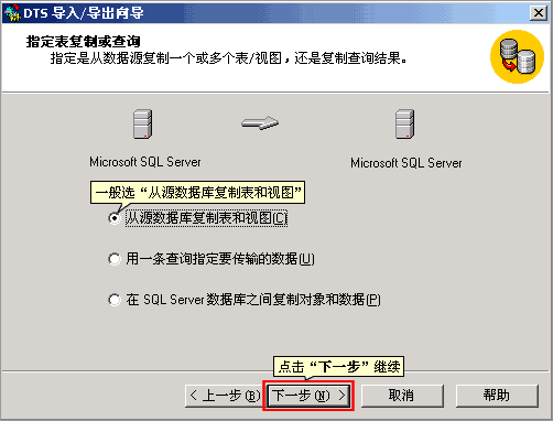 5. 选择复制方式,一般选“从源数据库复制表和视图”,点“下一步”继续